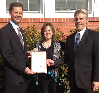 State Representative Scott Sanford (left) presents Melanie Hedrick, vice president of the Crape Myrtle Trails Board, and Phil Wheat, president, with a resolution honoring McKinney as “America’s Crape Myrtle City.”
